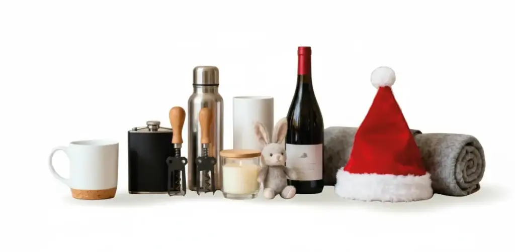 Regalos publicitarios para el hogar: tazas personalizadas, mantas, velas, utensilios de cocina, botellas térmicas y sets de vino, etc.
