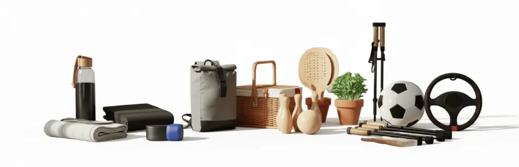 Regalos publicitarios de ocio y deporte: botellas reutilizables, toallas, pelotas antiestrés, esterillas, mochilas deportivas, etc.