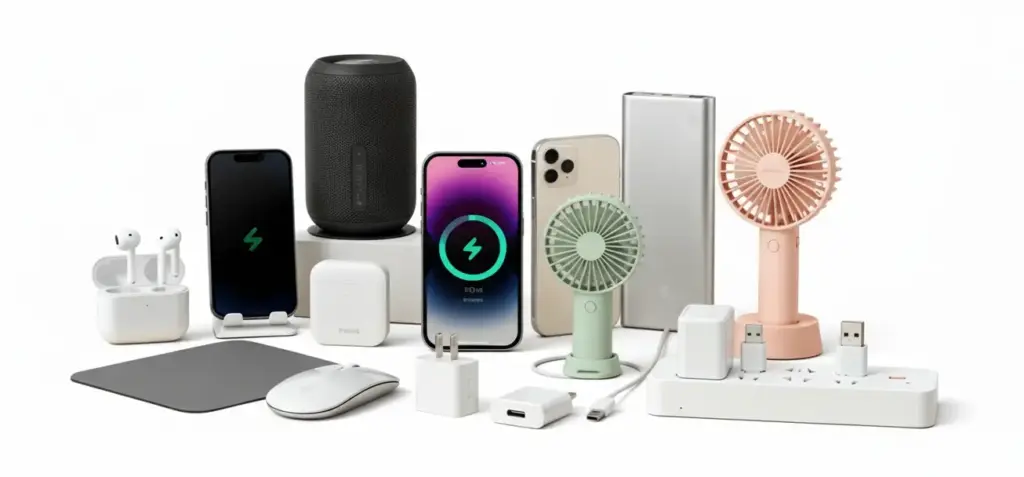 Regalos publicitarios de tecnología: auriculares, altavoces bluetooth, soportes de móvil, cargadores USB, ventiladores portátiles, etc.