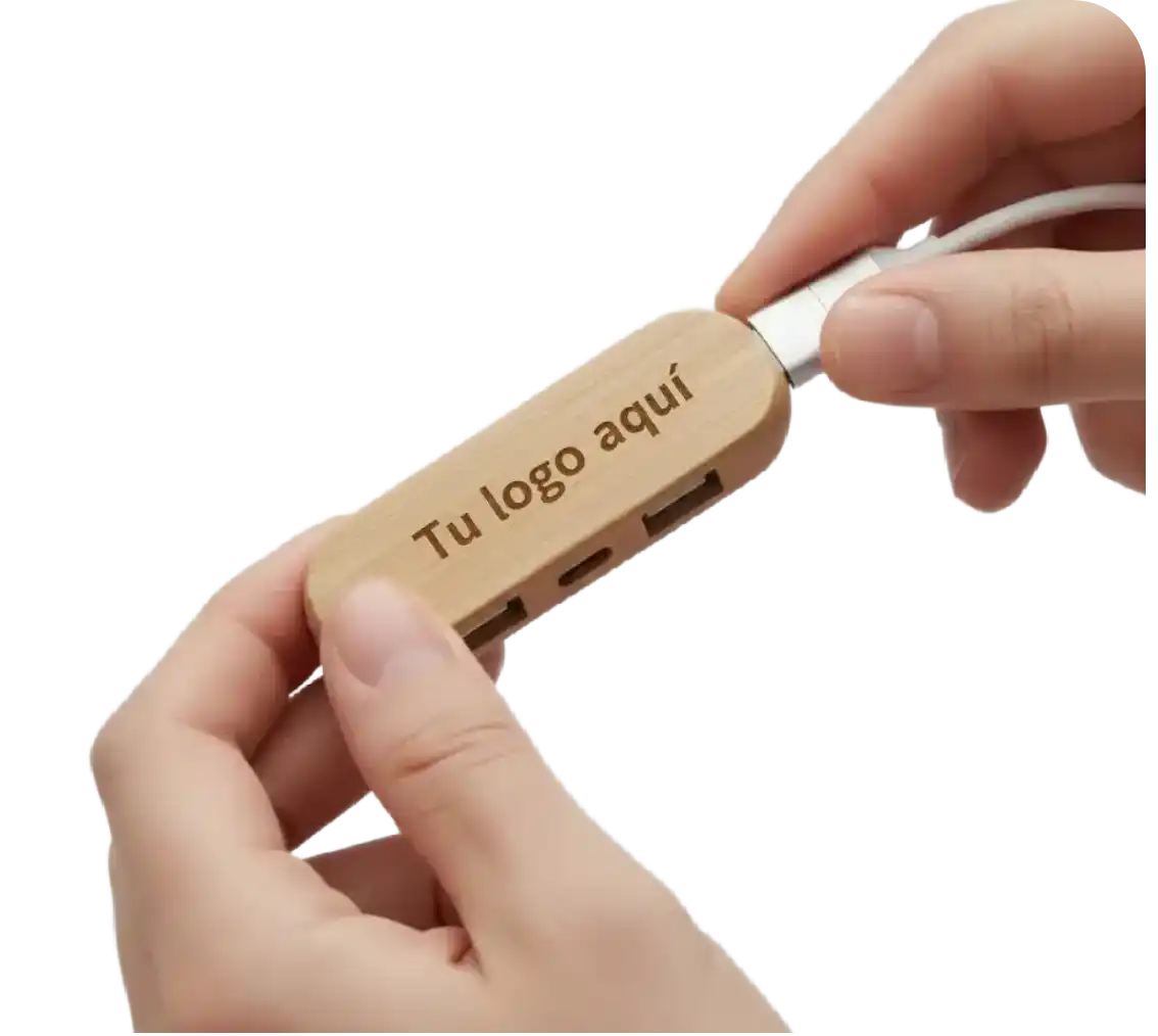 – Gravat làser en hubs USB metàl·lics o de bambú: tècnica elegant i permanent, ideal per a regals tecnològics d’alta gamma.
