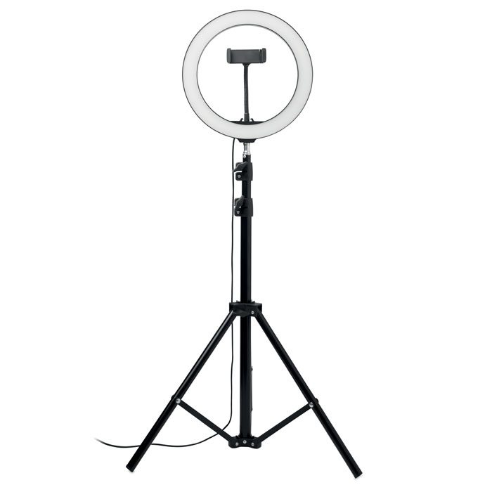 L’anell de llum LED Helo, ideal per a selfies i contingut digital corporatiu, ofereix una il·luminació professional i versàtil. Amb trípode extensible fins a 173 cm i suport per a telèfon, facilita la creació de vídeos i fotos per a promocions i campanyes de màrqueting. Els seus 120 LED i 10 nivells de brillantor asseguren una llum càlida i adaptable. Personalitza’l amb el teu logotip per a esdeveniments, fires o com un regal promocional publicitari i tecnològic. Un article promocional innovador i funcional en color negre.