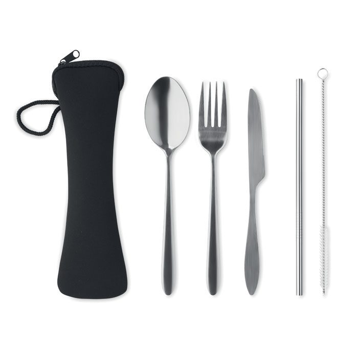 El set de coberts reutilitzables SERVICE és l’opció corporativa perfecta per a esdeveniments sostenibles. Inclou forquilla, ganivet, cullera, palleta i raspall de neteja, tot en acer inoxidable. La funda de neoprè protegeix els coberts i en facilita el transport. Disponible en negre i or, ideal com a regal promocional personalitzat amb el logotip de la teva empresa. Òptim per a campanyes de màrqueting que promoguin la sostenibilitat i la imatge de marca. Perfecte com a article promocional per a empreses amb consciència ecològica.