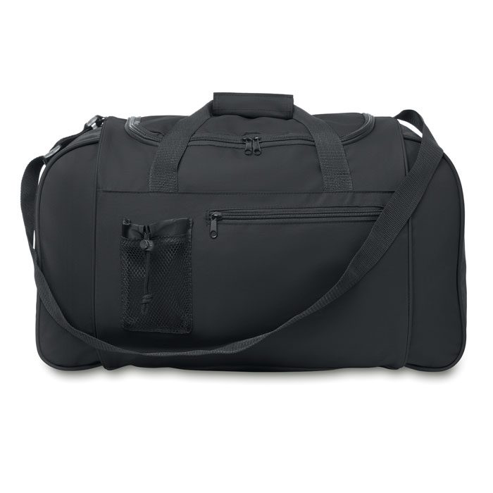 PARANA, bolsa deportiva corporativa ideal para campañas promocionales. Fabricada en resistente poliéster 600D, cuenta con un práctico bolsillo frontal y un bolsillo de rejilla lateral. Incluye bandolera ajustable y desmontable para mayor comodidad. Perfecta para personalizar con el logo de tu empresa mediante serigrafía. Disponible en color negro, esta bolsa deportiva promocional es un excelente regalo corporativo para eventos y actividades deportivas. Medidas: 57 x 24 x 35 cm. Consigue una bolsa deportiva personalizada de gran visibilidad para tu marca.